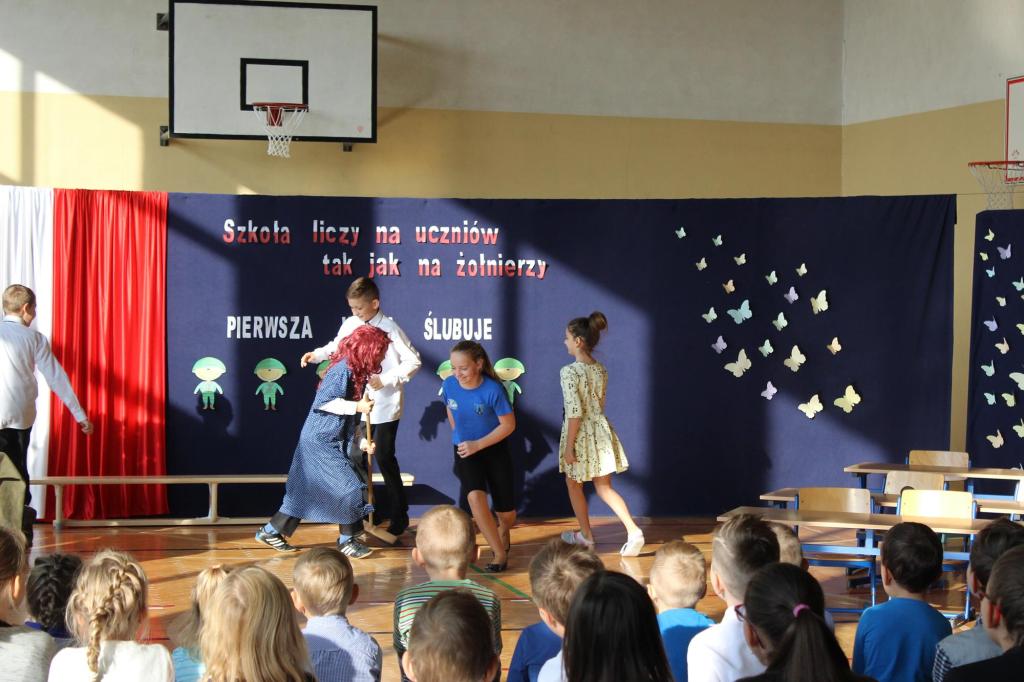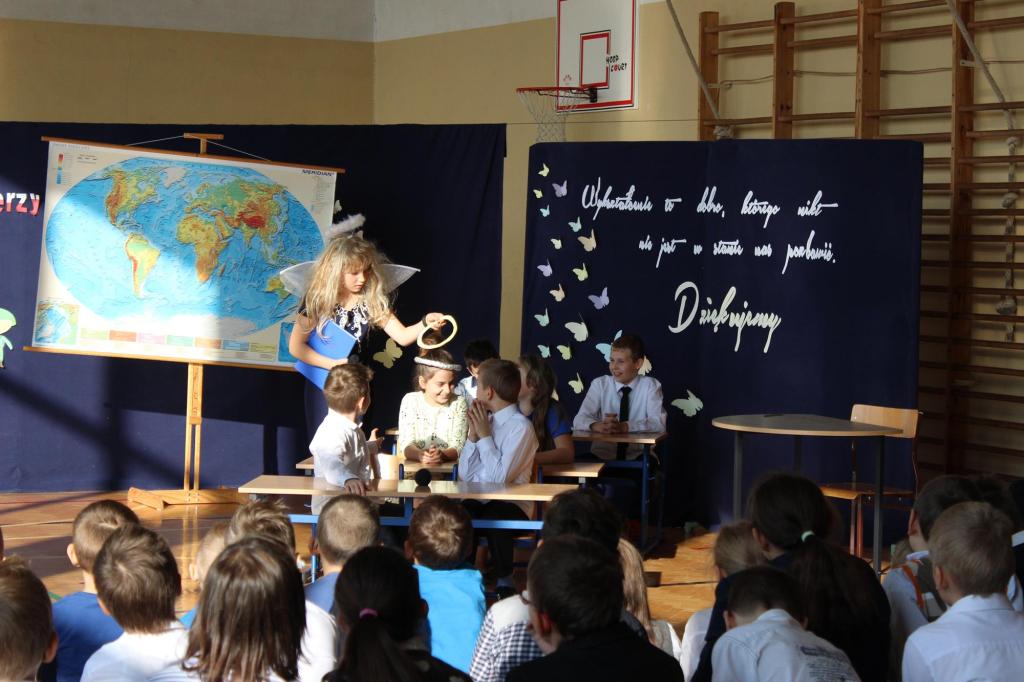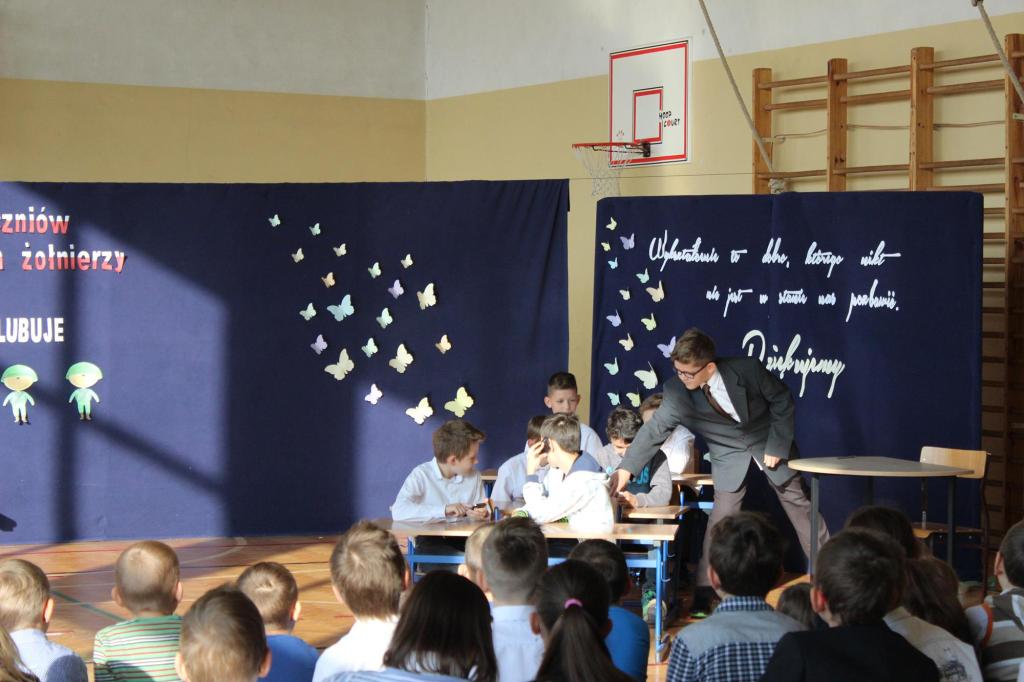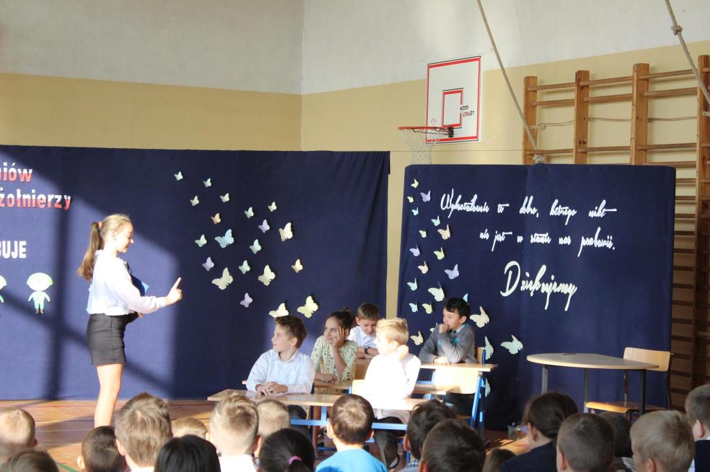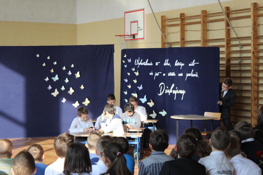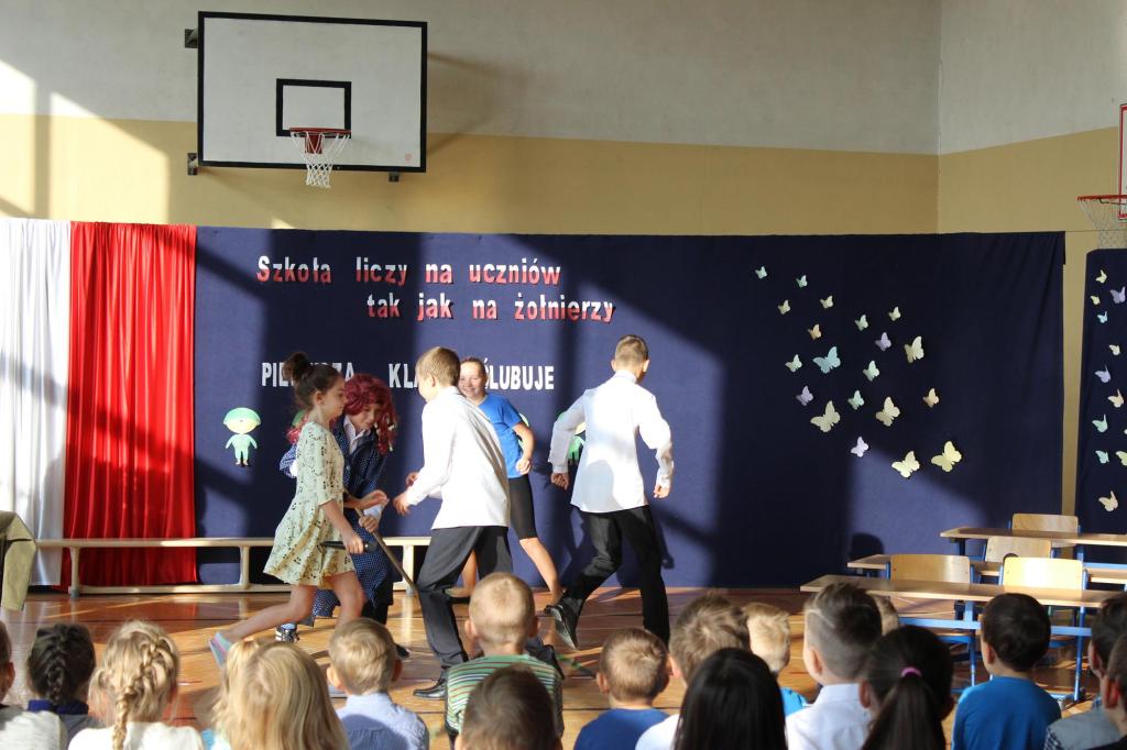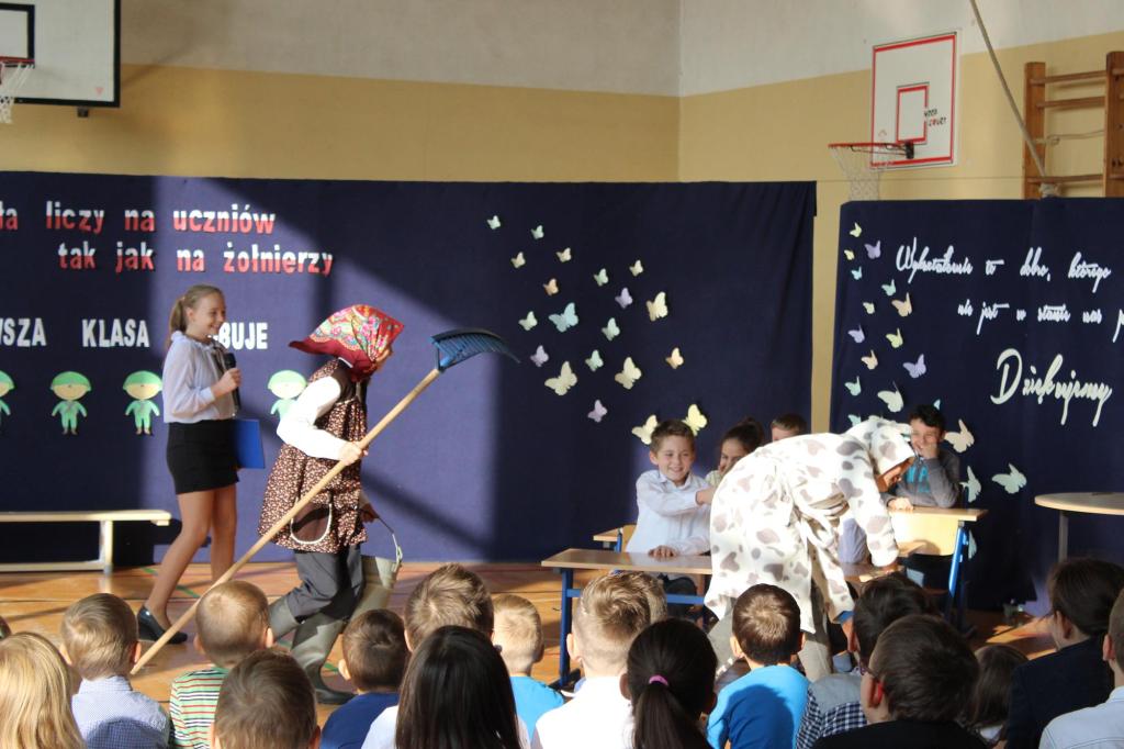 Uczniowie klasy szóstej z okazji Dnia Edukacji Narodowej przygotowali miłą niespodziankę. Kabaret w ich wykonaniu był podziękowaniem Nauczycielom i Pracownikom Szkoły za ich trud i poświęcenie oraz przekazaną wiedzę i umiejętności. Ku zaskoczeniu wszystkich okazało się, ze uczniowie klasy szóstej wykazują się wyjątkowymi zdolnościami aktorskimi. Humorystyczne scenki z życia klasy ubogacone trafnym repertuarem muzycznym, oryginalnymi strojami i rekwizytami, piękną grą młodych aktorów, wywołały na twarzach widzów uśmiech i wzbudziły wiele pięknych emocji. Wdzięczni Nauczyciele i Pracownicy Szkoły z pewnością zapamiętają je na długo.