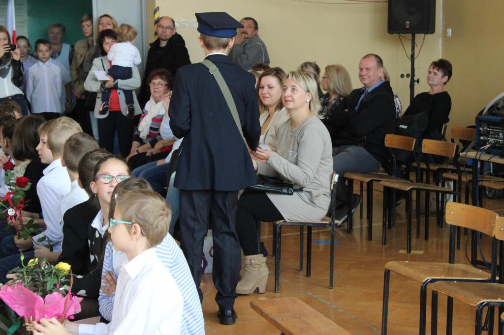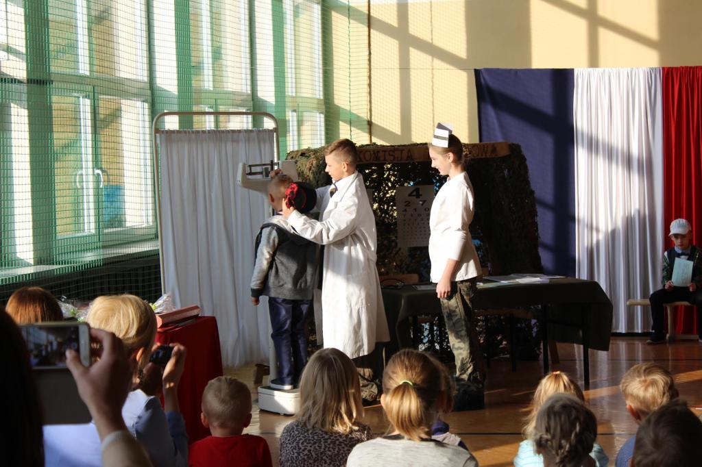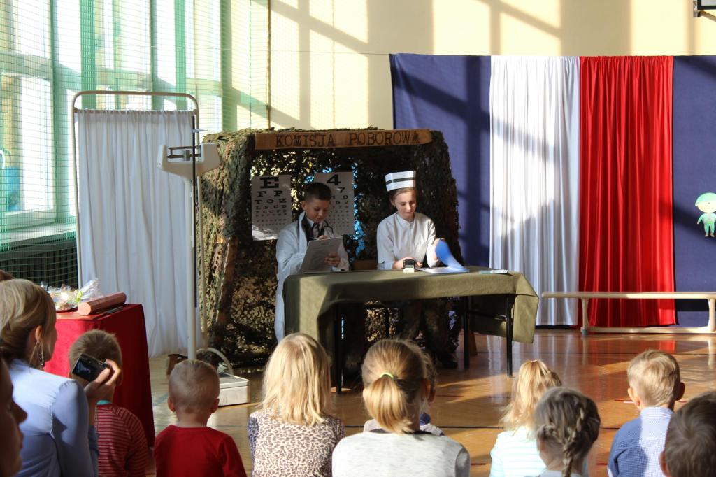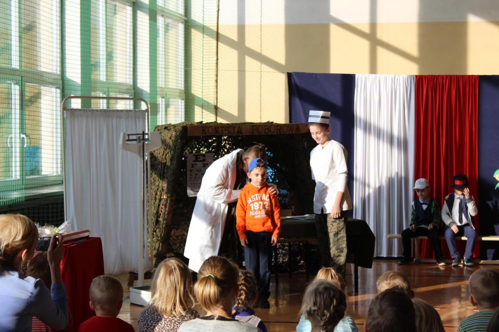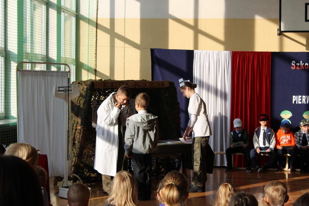 Czekający na naszych pierwszaków generał poddał ich trudnym próbom. Była musztra, egzamin z wiedzy o dobrym zachowaniu i nie tylko. Pierwszoklasiści doskonale poradzili sobie ze wszystkimi zadaniami i generał poprosił Pana Dyrektora, aby pasował ich na uczniów.