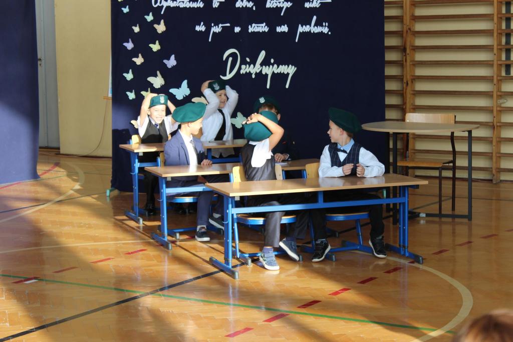 Do grzecznie siedzących na widowni, niczego nie spodziewających się pierwszaków podjechał listonosz i wręczył im powołania do szkoły. Rad nie rad pożegnali się z rodzicami i wyruszyli w samodzielną podróż do wojska.