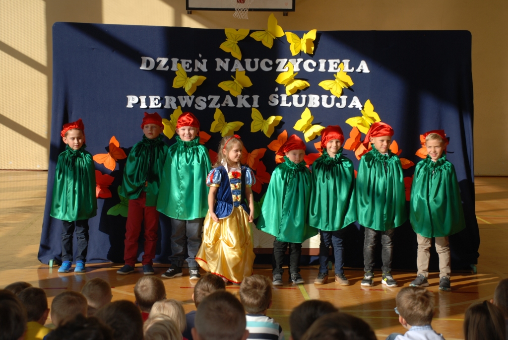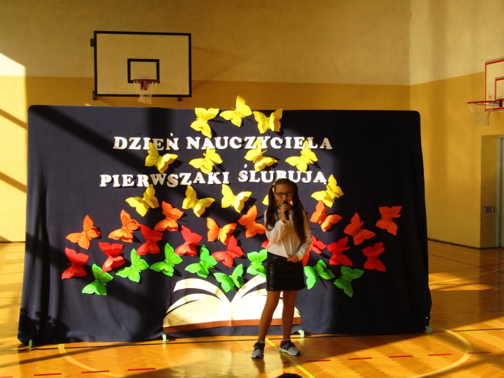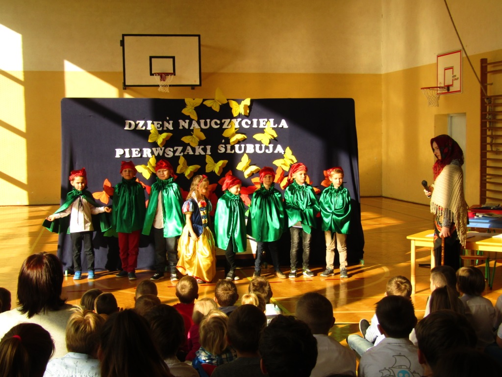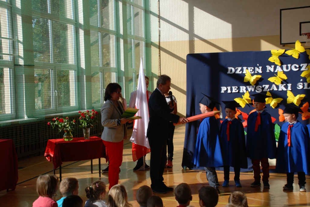Choć dzień później bo w poniedziałek -15 października w naszej szkole nie zapomnieliśmy o uroczystym uczczeniu Święta Edukacji Narodowej, które w tym roku wypadło w niedzielę. Dzień Edukacji Narodowej popularnie zwany Dniem Nauczyciela jest polskim świętem państwowym oświaty i szkolnictwa wyższego. Ten wyjątkowy dzień dla polskiej edukacji ustanowiono 27 kwietnia 1972r. na mocy ustawy: Karta praw i obowiązków nauczyciela pod nazwą Dzień Nauczyciela, następnie w 1982r. zmieniono na Dzień Edukacji Narodowej. Apel z tej okazji jak zwykle był bardzo uroczysty. Tradycją w naszej szkole jest to, że w tym dniu odbywa się także pasowanie na uczniów najmłodszych dzieci, którzy we wrześniu rozpoczęli naukę w szkole. Aby zostać "prawdziwymi" uczniami dzieci musiały przejść przez szereg zadań przygotowanych dla nich, które wykazać miały czy są oni gotowi do nauki w szkole. Dzieci miały między innymi zaśpiewać piosenkę, wyrecytować wierszyk, ułożyć obrazek z puzzli, a także wypić sok z cytryny i uśmiechnąć się. Wszyscy pozytywnie zaliczyli wszystkie z powyższych zadań i mogli złożyć ślubowanie, co było świadectwem przyjęcia w poczet uczniów naszej szkoły. W części oficjalnej Pan Dyrektor pasował wszystkie dzieci z I klasy na uczniów i wręczył pamiątkowe dyplomy. Wszyscy życzyliśmy pierwszoklasistom szóstek lub piątek oraz zachęcamy do dzielnego pokonywania napotkanych trudności. Uroczystość ta była ważnym wydarzeniem nie tylko dla dzieci, ale także rodziców, którzy gorliwie upamiętniali te chwile. Dzień ten zapewne na długo pozostanie w naszej pamięci. W drugiej części uroczystości, uczniowie z klasy V dały przedstawienie poświecone Dniu Edukacji Narodowej prezentując humorystyczne scenki dotyczące życia szkolnego. Dzieci podziękowały wszystkim nauczycielom i pracownikom szkoły za trud i okazane serce symbolicznym kwiatkiem, wierszem i piosenką.