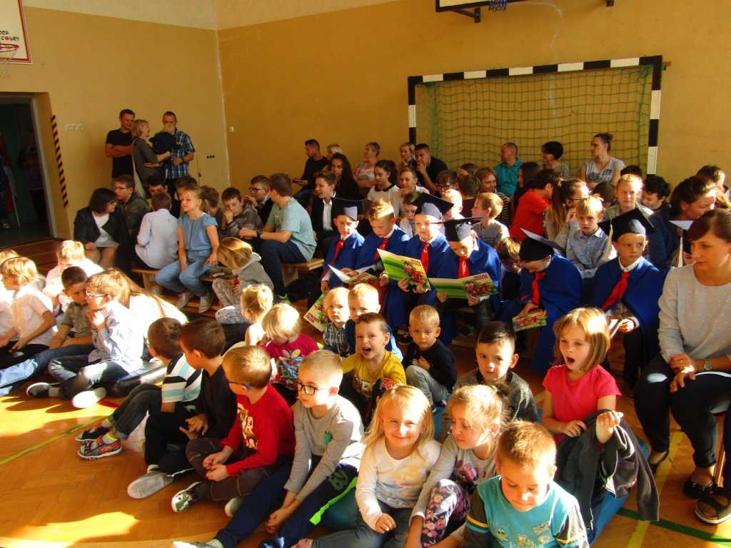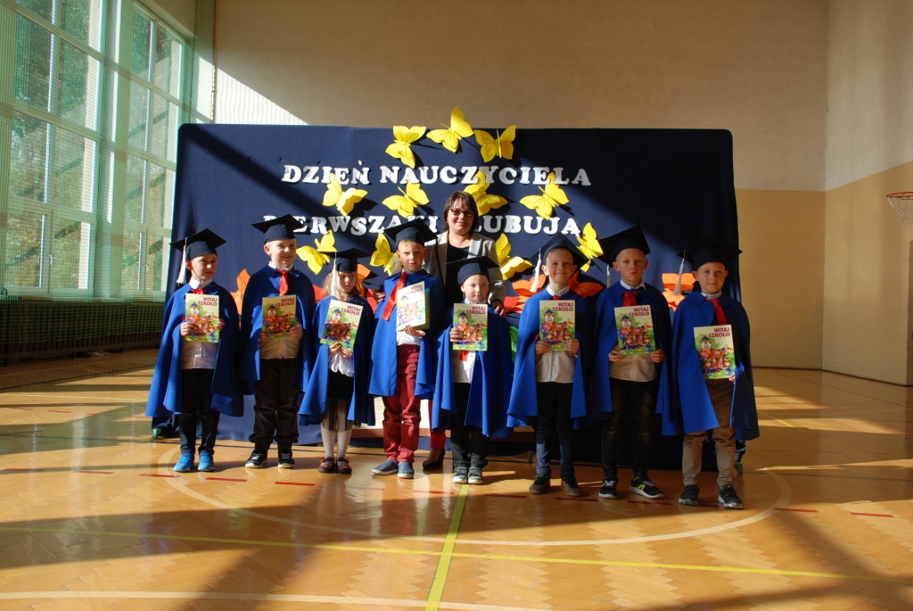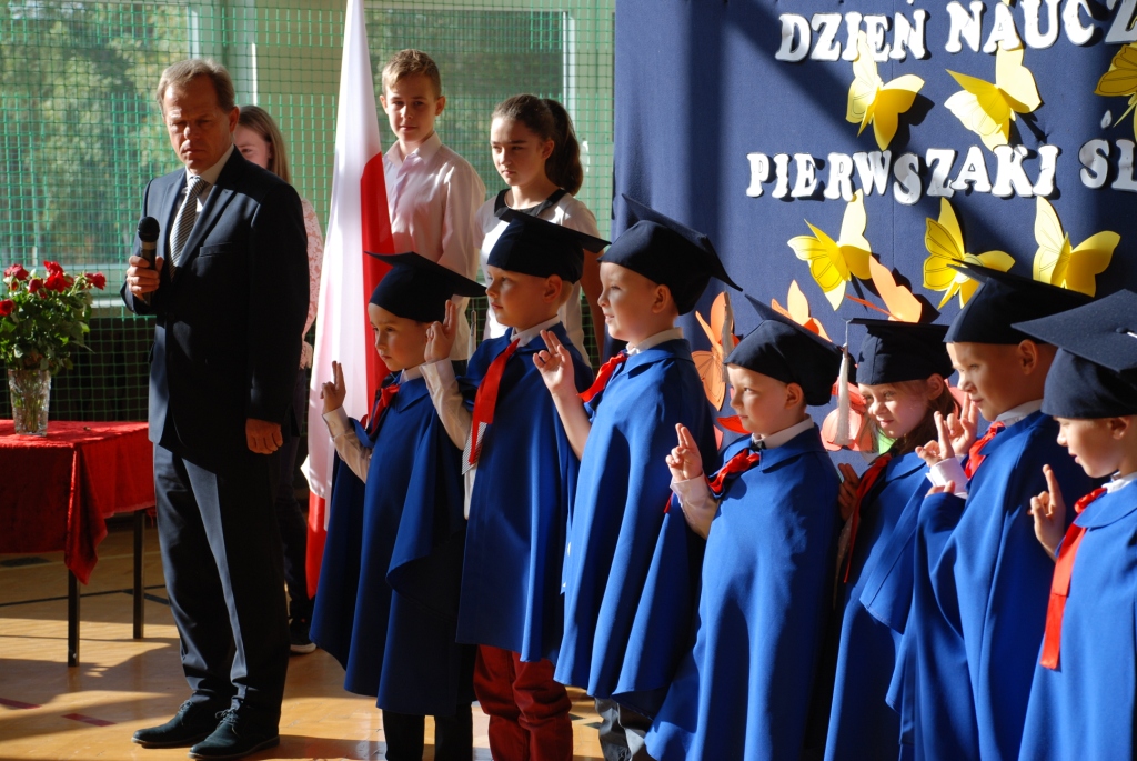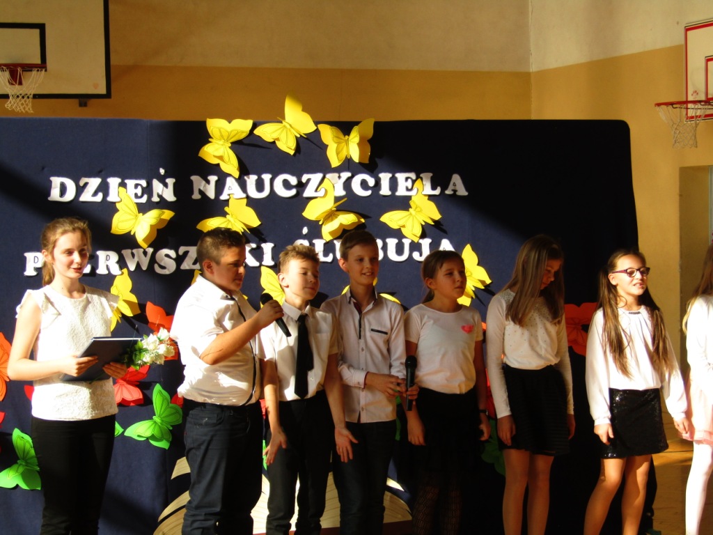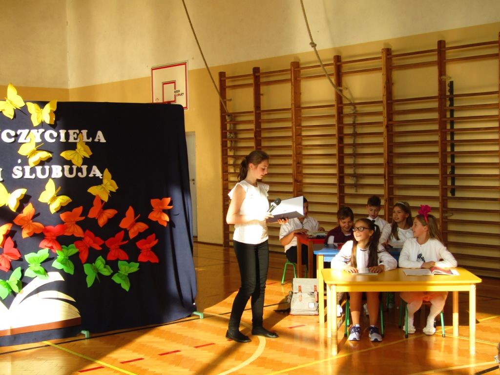 Choć dzień później bo w poniedziałek -15 października w naszej szkole nie zapomnieliśmy o uroczystym uczczeniu Święta Edukacji Narodowej, które w tym roku wypadło w niedzielę. Dzień Edukacji Narodowej popularnie zwany Dniem Nauczyciela jest polskim świętem państwowym oświaty i szkolnictwa wyższego. Ten wyjątkowy dzień dla polskiej edukacji ustanowiono 27 kwietnia 1972r. na mocy ustawy: Karta praw i obowiązków nauczyciela pod nazwą Dzień Nauczyciela, następnie w 1982r. zmieniono na Dzień Edukacji Narodowej. Apel z tej okazji jak zwykle był bardzo uroczysty. Tradycją w naszej szkole jest to, że w tym dniu odbywa się także pasowanie na uczniów najmłodszych dzieci, którzy we wrześniu rozpoczęli naukę w szkole. Aby zostać "prawdziwymi" uczniami dzieci musiały przejść przez szereg zadań przygotowanych dla nich, które wykazać miały czy są oni gotowi do nauki w szkole. Dzieci miały między innymi zaśpiewać piosenkę, wyrecytować wierszyk, ułożyć obrazek z puzzli, a także wypić sok z cytryny i uśmiechnąć się. Wszyscy pozytywnie zaliczyli wszystkie z powyższych zadań i mogli złożyć ślubowanie, co było świadectwem przyjęcia w poczet uczniów naszej szkoły. W części oficjalnej Pan Dyrektor pasował wszystkie dzieci z I klasy na uczniów i wręczył pamiątkowe dyplomy. Wszyscy życzyliśmy pierwszoklasistom szóstek lub piątek oraz zachęcamy do dzielnego pokonywania napotkanych trudności. Uroczystość ta była ważnym wydarzeniem nie tylko dla dzieci, ale także rodziców, którzy gorliwie upamiętniali te chwile. Dzień ten zapewne na długo pozostanie w naszej pamięci. W drugiej części uroczystości, uczniowie z klasy V dały przedstawienie poświecone Dniu Edukacji Narodowej prezentując humorystyczne scenki dotyczące życia szkolnego. Dzieci podziękowały wszystkim nauczycielom i pracownikom szkoły za trud i okazane serce symbolicznym kwiatkiem, wierszem i piosenką.