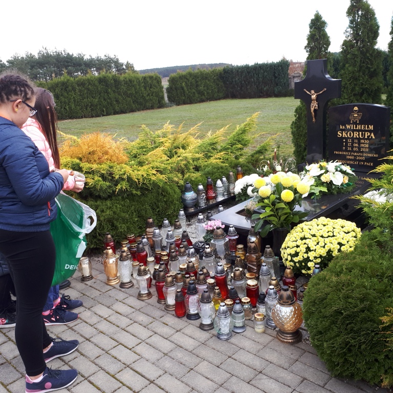 Początek listopada to dni pełne zadumy i nostalgii. Z okazji odbywającej się właśnie pierwszego listopada uroczystości Wszystkich Świętych uczniowie naszej szkoły odwiedzili cmentarz parafialny w Domecku by tam modlić się za wszystkich zmarłych spoczywających na tym cmentarzu, a także za wszystkich zmarłych z naszych rodzin spoczywających na innych cmentarzach. Zapaliliśmy znicze także przy grobie ks. proboszcza seniora Wilhelma Skorupy, który niegdyś uczył religii w naszej szkole. Podczas krótkiej, aczkolwiek ważnej wizyty na cmentarzu staraliśmy się aby nasi uczniowie uświadomili sobie, że cmentarz to miejsce, w którym należy zachować powagę i uszanować miejsce spoczynku tych, którzy odeszli.