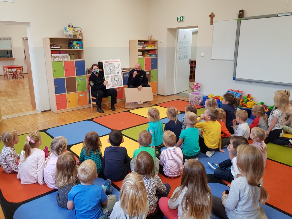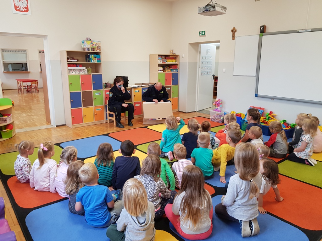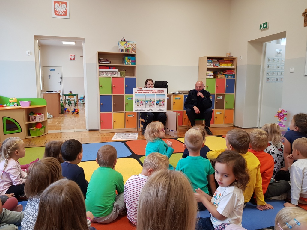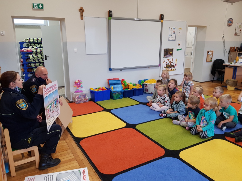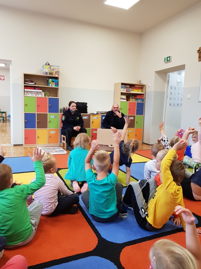 Temat bezpieczeństwa jest dzieciom szczególnie bliski. Z tej okazji do oddziału przedszkolnego zawitali Strażnicy Miejscy, którzy zapoznali dzieci z zasadami prawidłowego zachowania się na drodze, w domu, kiedy nie ma dorosłego a także w czasie spotkania z nieznanym psem. Dzieci z zaangażowaniem odpowiadały na pytania Strażników, zadawały również własne pytania na nurtujące ich problemy. Strażnicy poruszyli także kwestię bycia widocznym po zmierzchu i wręczyli wszystkim dzieciom odblaski.