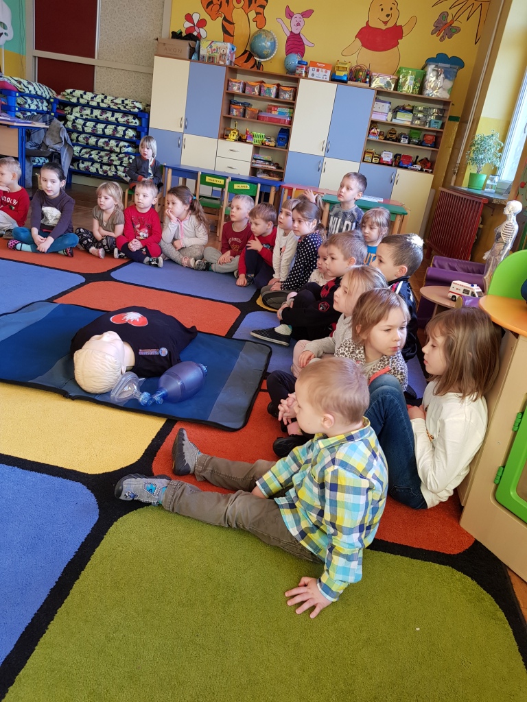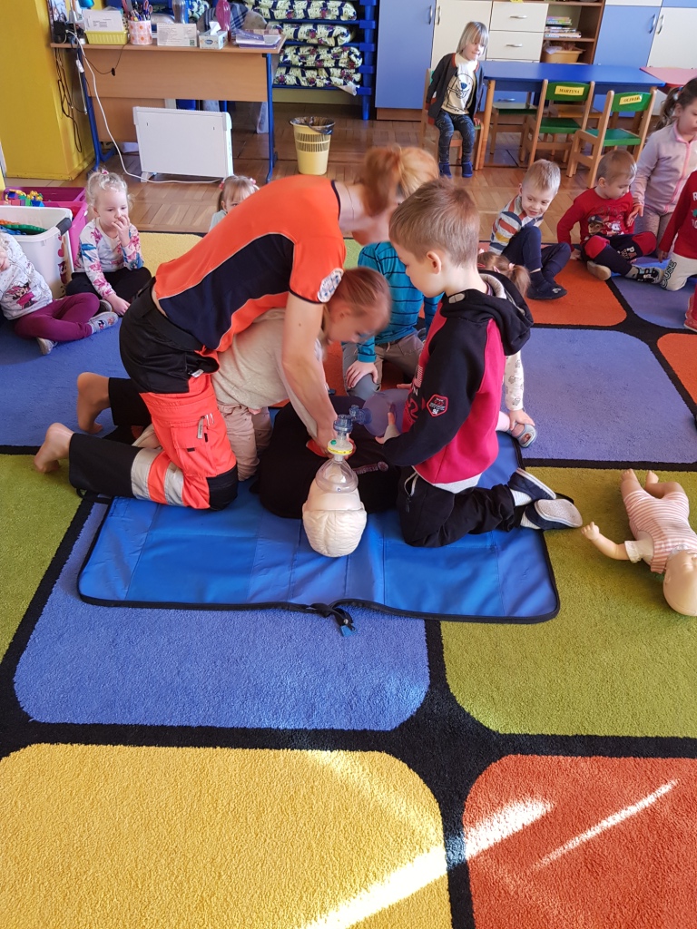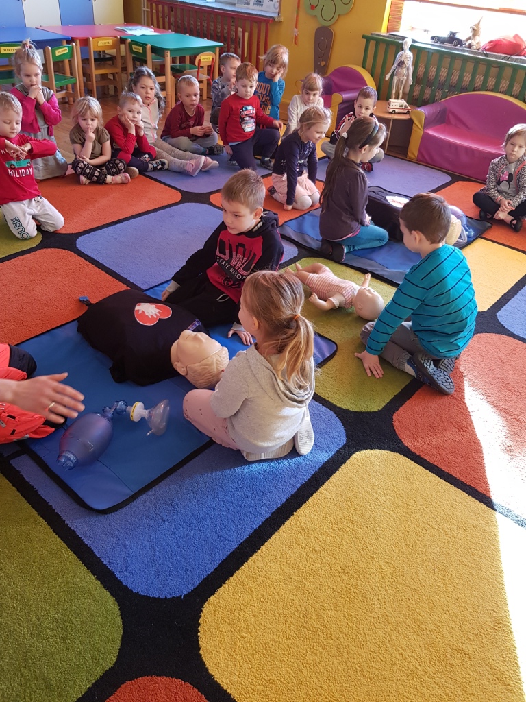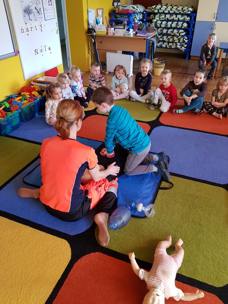W styczniu przedszkolaków odwiedziła pani Sabina, która opowiedziała o swojej pracy ratownika medycznego w karetce oraz zapoznała dzieci z zasadami udzielania pierwszej pomocy. Każde dziecko miało możliwość praktycznego zastosowania zdobytej wiedzy ćwicząc udzielanie pierwszej pomocy na fantomach.