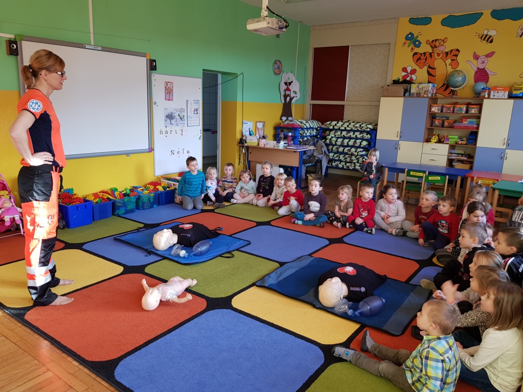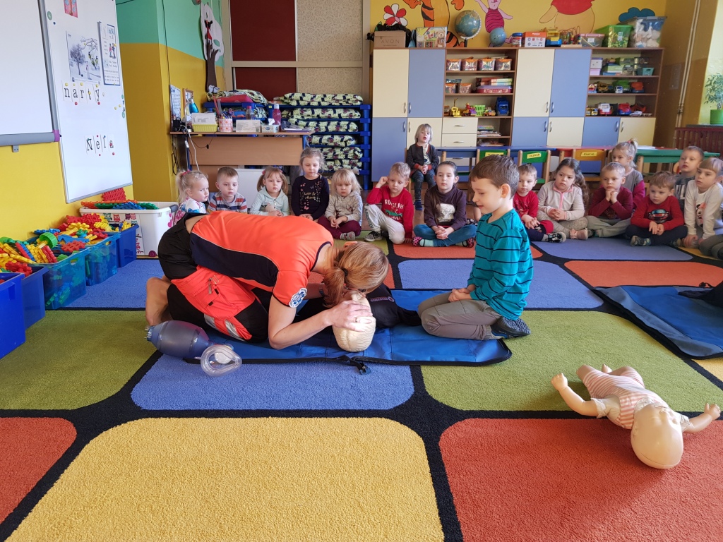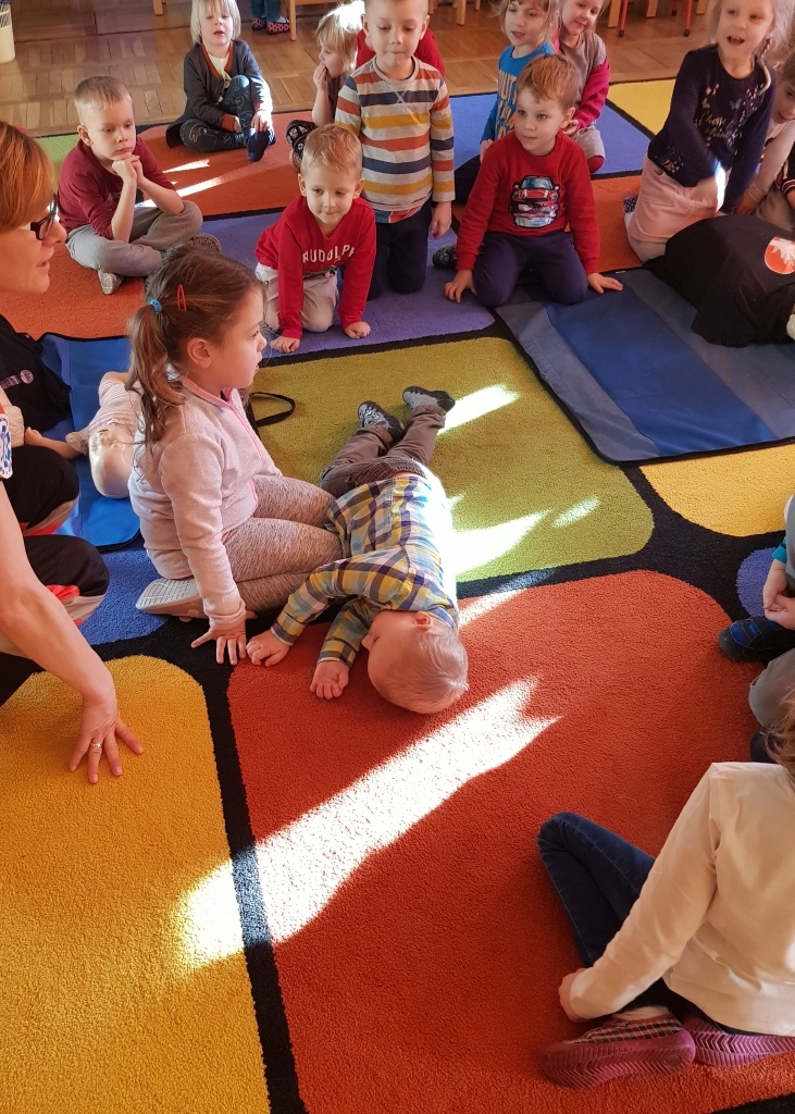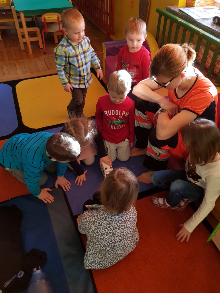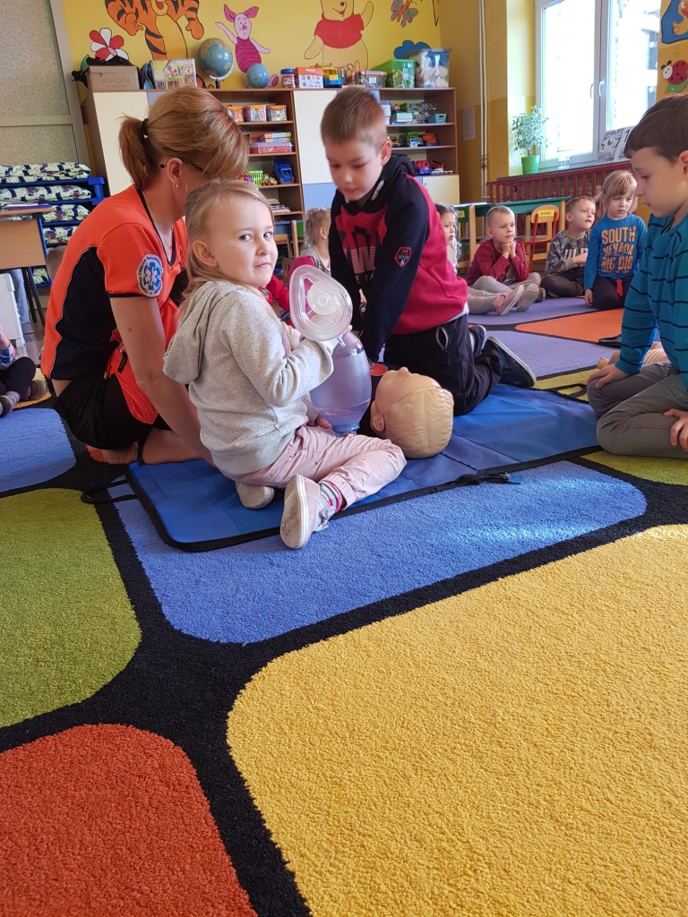 W styczniu przedszkolaków odwiedziła pani Sabina, która opowiedziała o swojej pracy ratownika medycznego w karetce oraz zapoznała dzieci z zasadami udzielania pierwszej pomocy. Każde dziecko miało możliwość praktycznego zastosowania zdobytej wiedzy ćwicząc udzielanie pierwszej pomocy na fantomach.