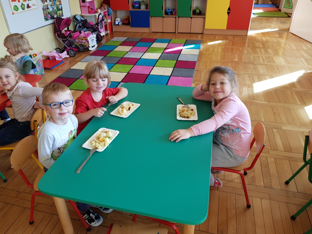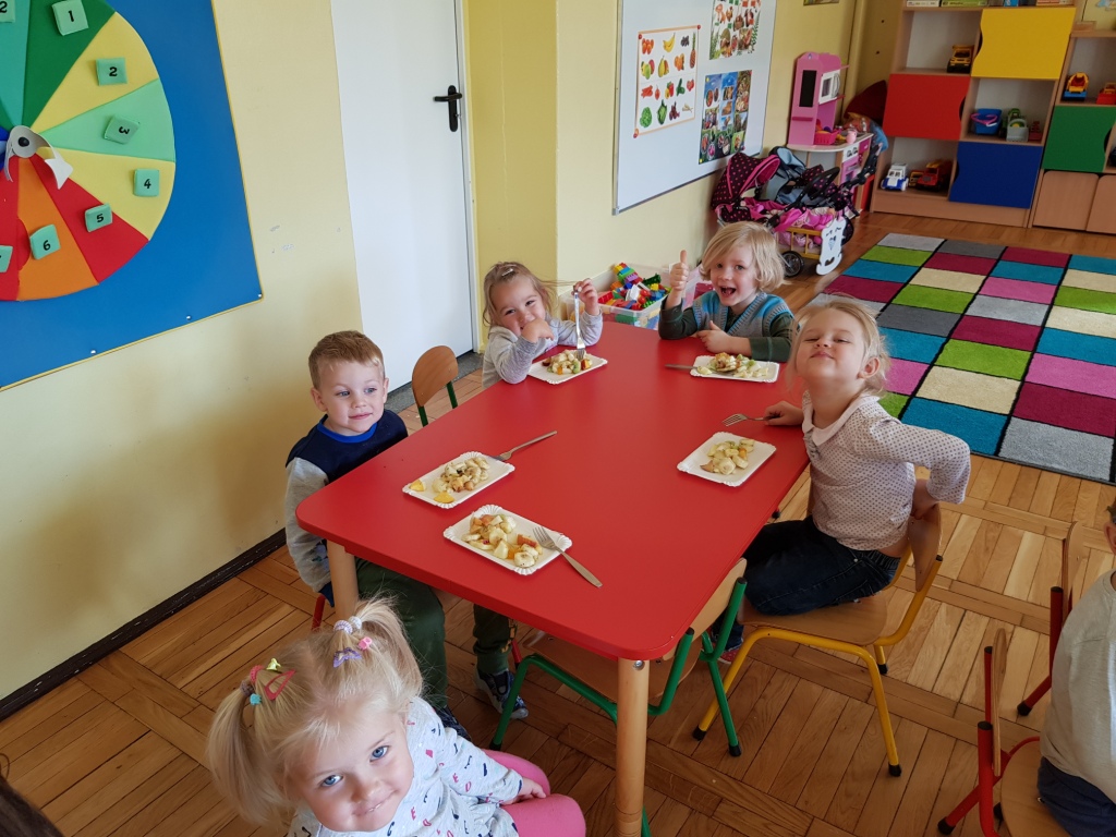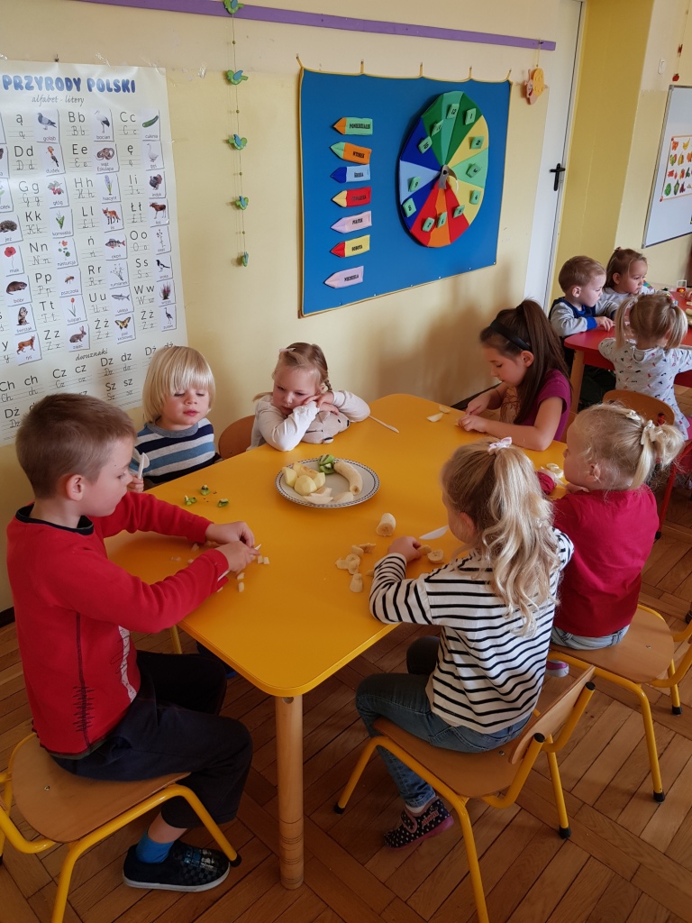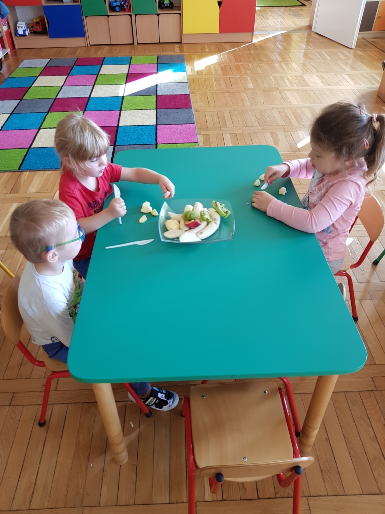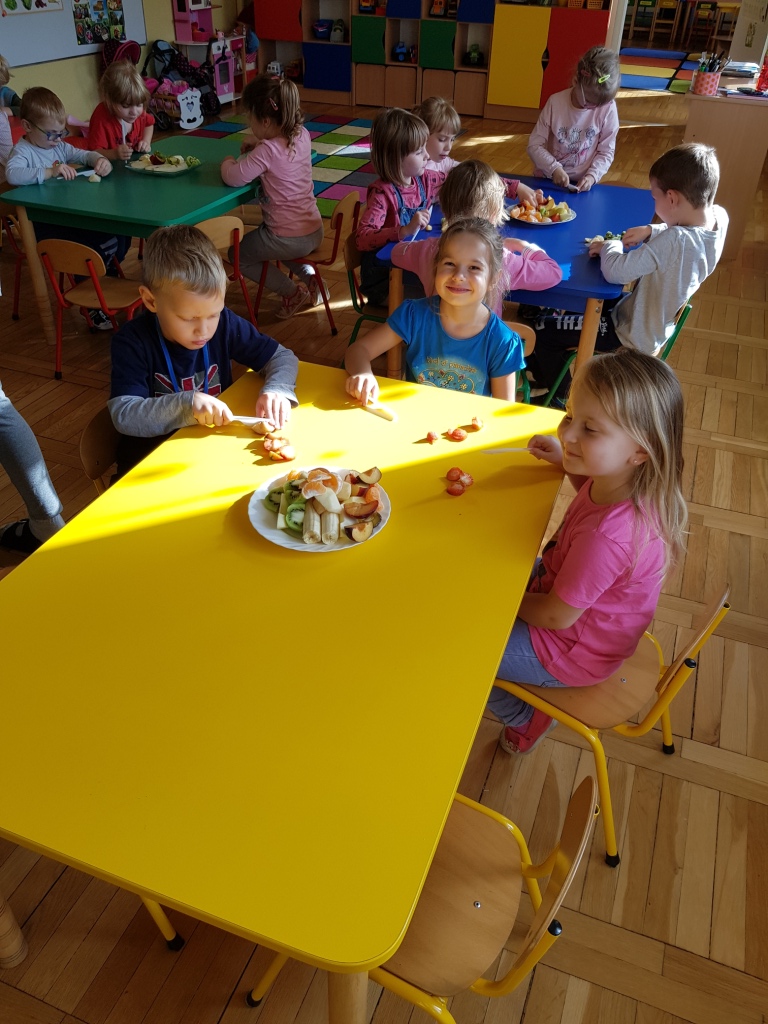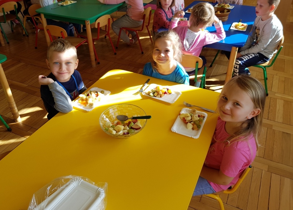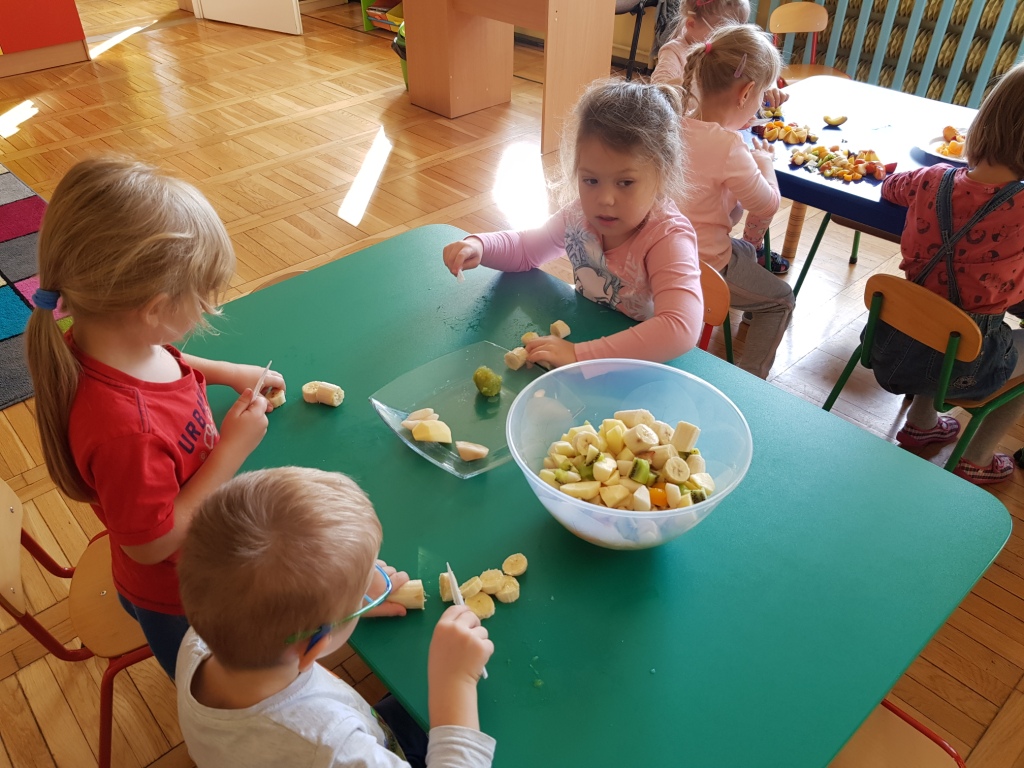 Nic nie smakuje równie dobrze jak własnoręcznie przygotowany posiłek, dlatego też przedszkolaki samodzielnie przygotowały sałatkę owocową. Dzieci miały okazję, aby ćwiczyć krojenie owoców nożem, przypomniały sobie także nazwy i smak owoców oraz miejsca, w których rosną. Sałatką zajadały się nawet największe niejadki.