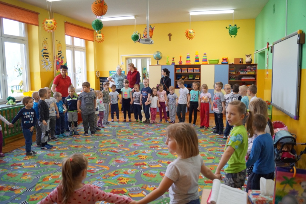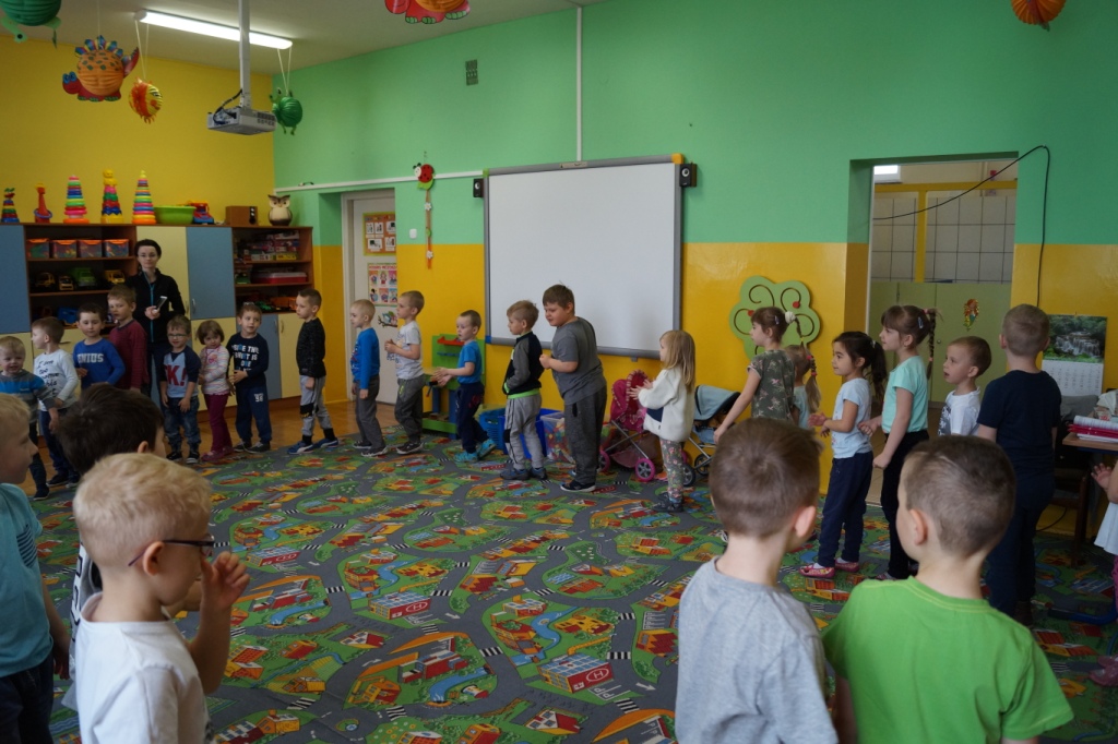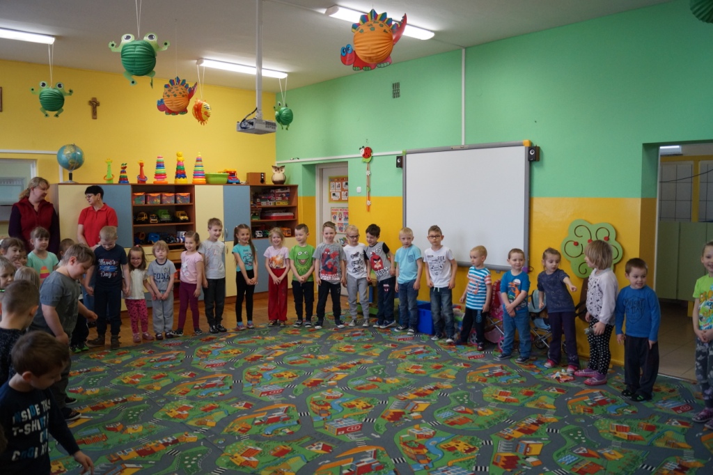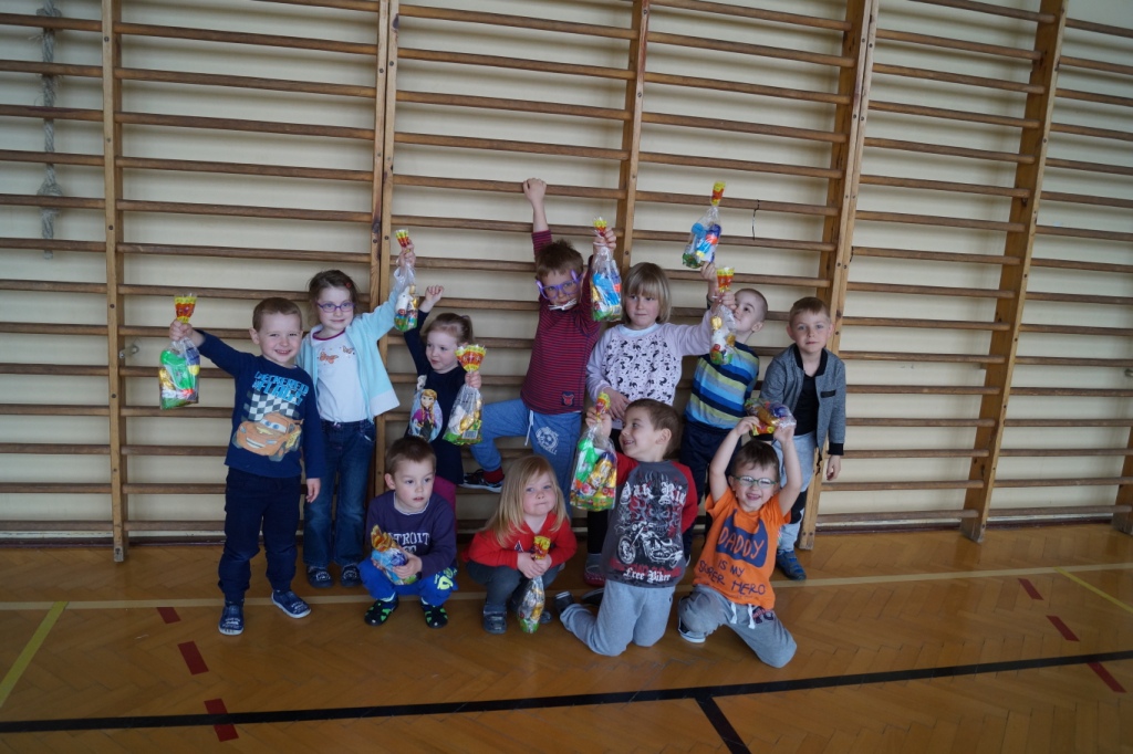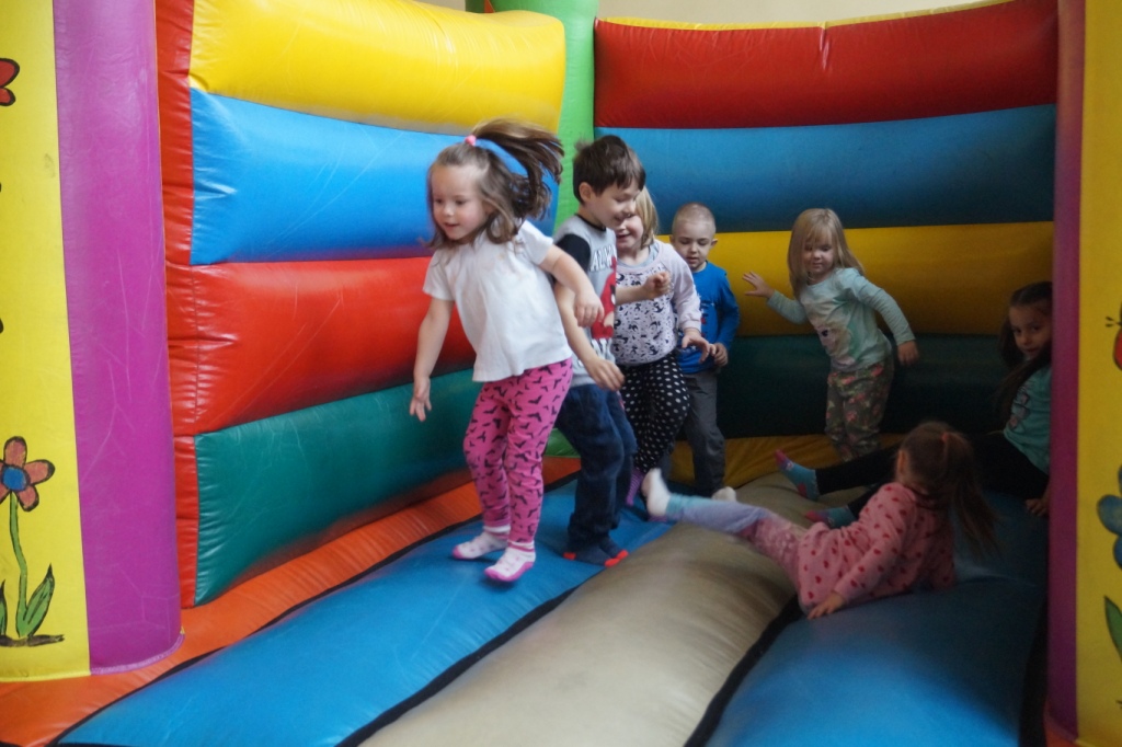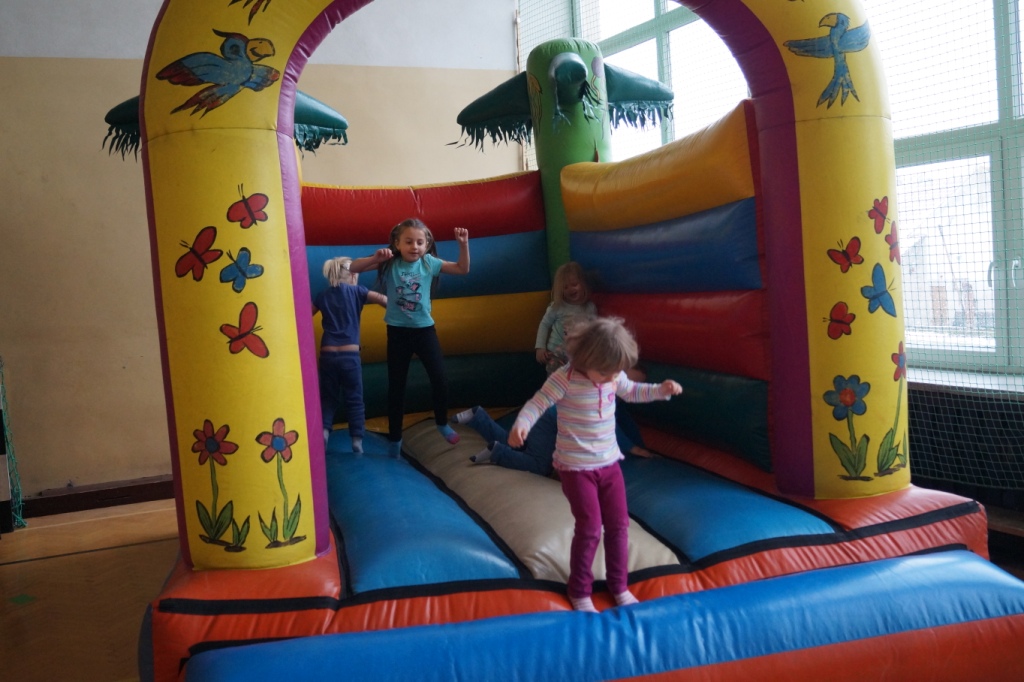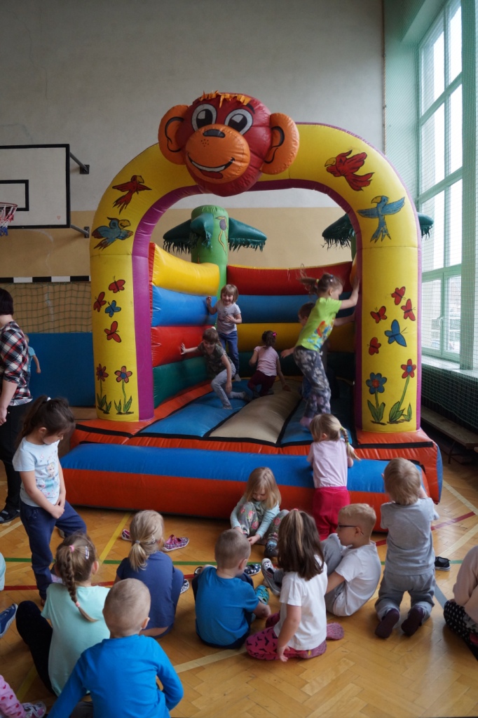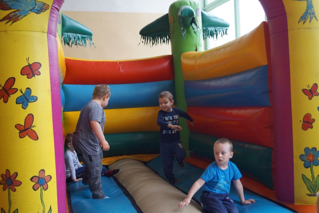 19 kwietnia przedszkolaków odwiedzili długo oczekiwani goście- koledzy z Oddziału Przedszkolnego w Wawelnie. Były wspólne tańce, zabawy, gra w piłkę a także dmuchany zamek, który sprawił dzieciom dużo radości. Po wspólnej zabawie na wszystkich czekał poczęstunek. Mimo brzydkiej pogody humory dopisywały a wspólnie spędzony czas minął bardzo szybko. Przedszkolaki z Domecka z niecierpliwością czekają na kolejne spotkanie i bardzo dziękują za prezenty, które otrzymały.
