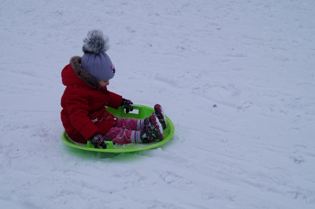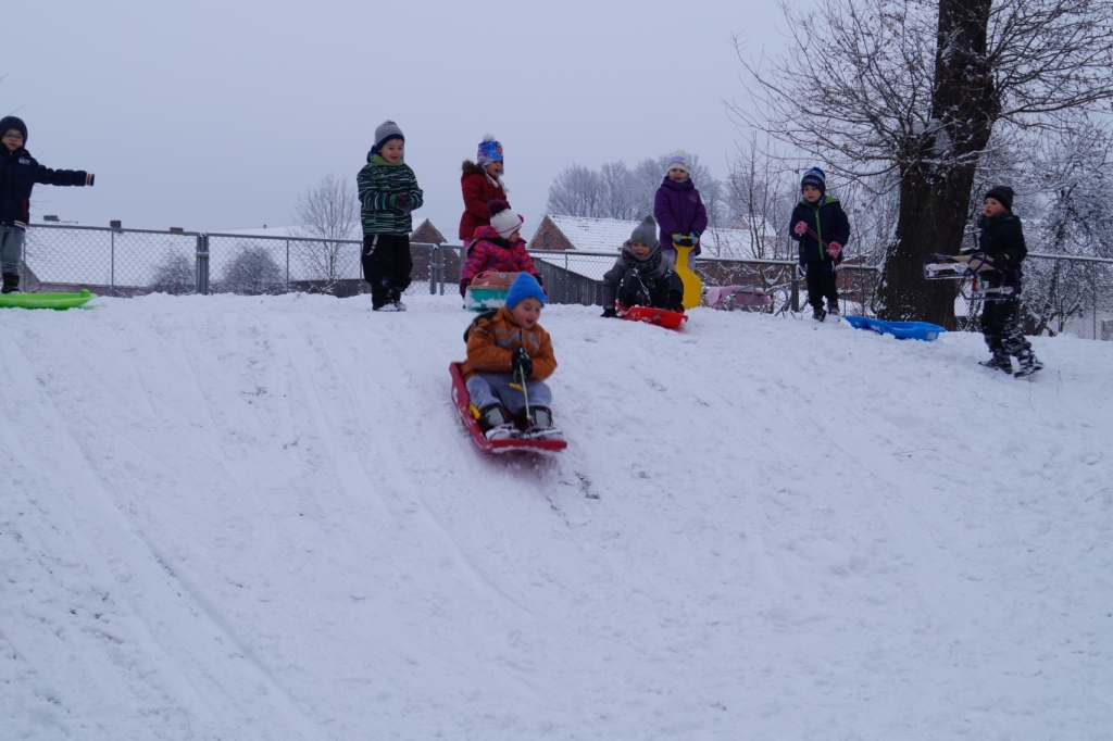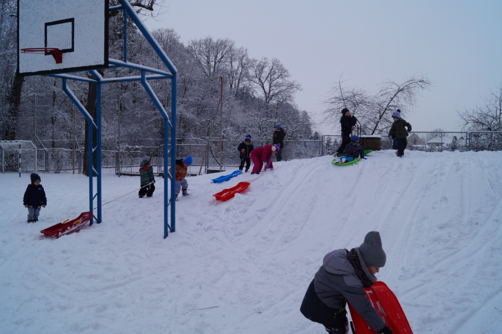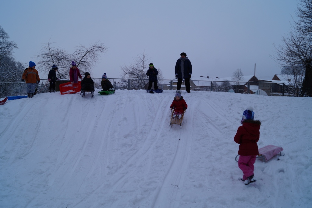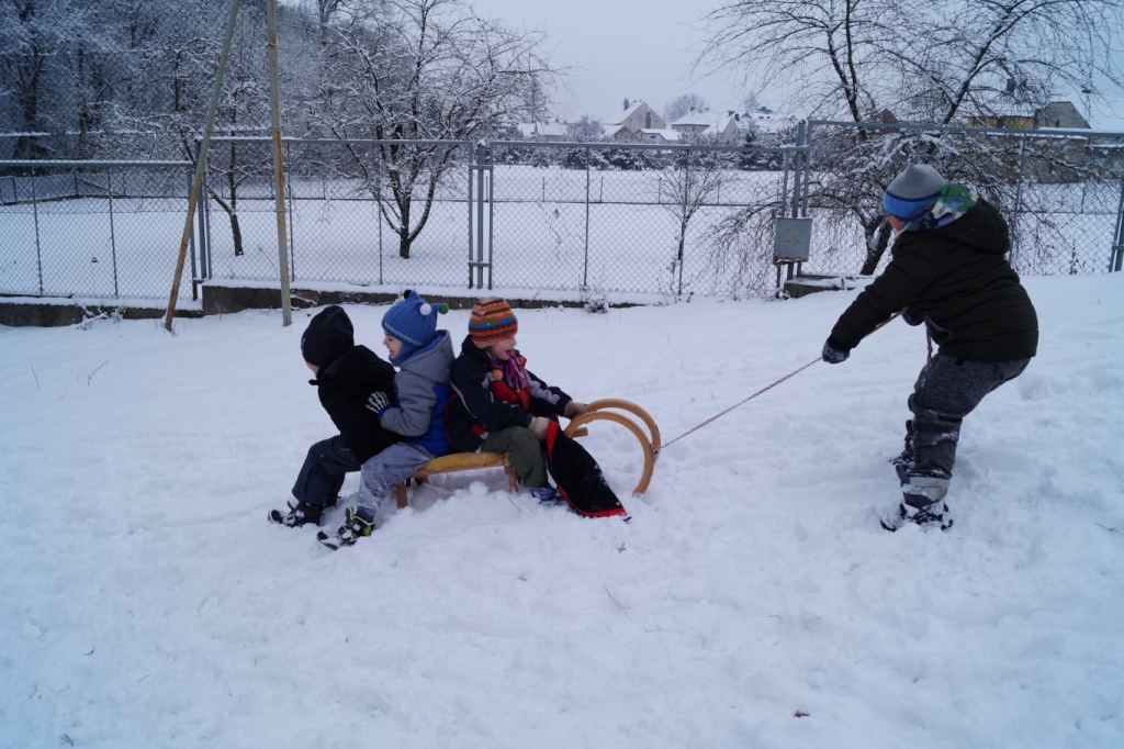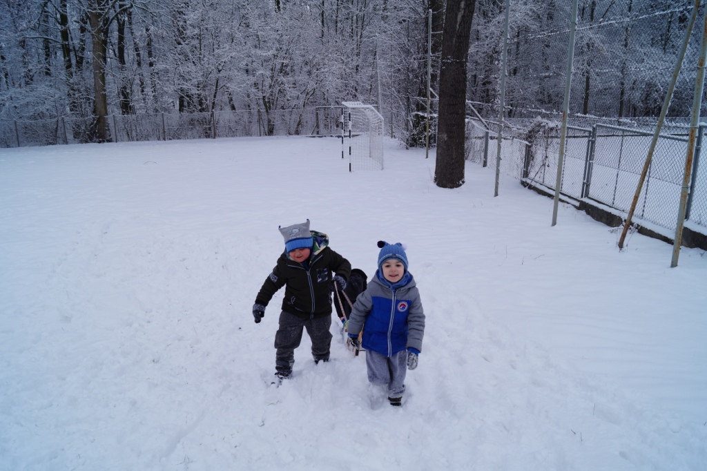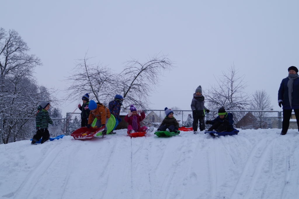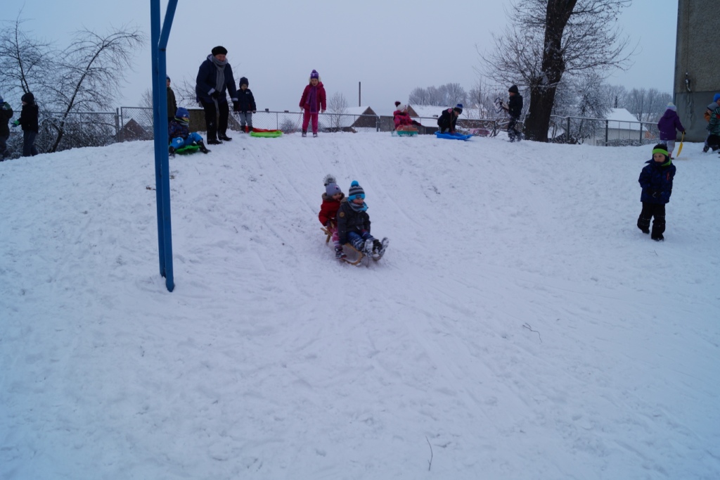 Jako że styczeń przyniósł piękną zimową pogodę, przedszkolaki zabrały ze sobą sanki i wspólnie wybraliśmy się na boisko szkolne. Było zjeżdżanie z górki, bitwy na śnieżki, aniołki na śniegu a radosne piski niosły się po całym Domecku.